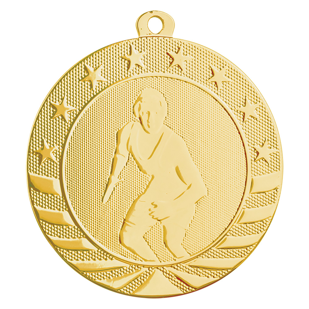 The 2″ Bright Gold Wrestling Starbrite Medal sports award from awardsforless.com can be engraved and customized to recognize the highest achievement and is available for your personalization.