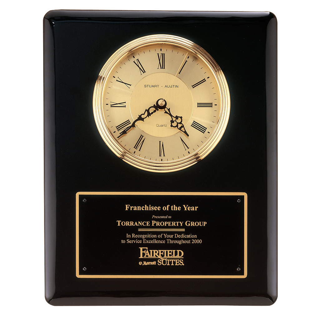 Waterfall bezel with glass lens; diamond-turned gold metal dial and three hand movement. Laser engravable plate(s). Solid brass engraving plate(s). Individually boxed. Clock supplied with lifetime guaranteed quartz movement.